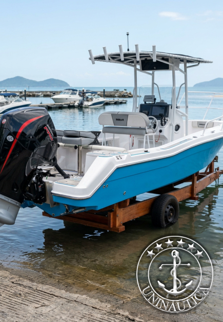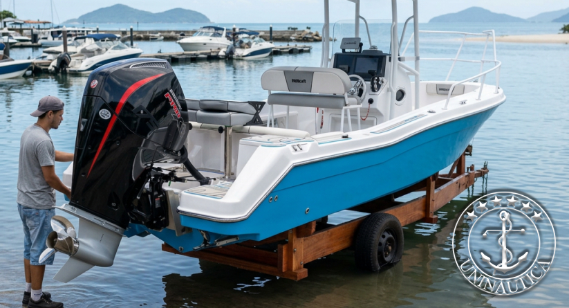 Com um motor de 150hp a 200hp, o consumo médio costuma girar entre 30 e 40 litros/hora, dependendo das condições do mar e da carga.